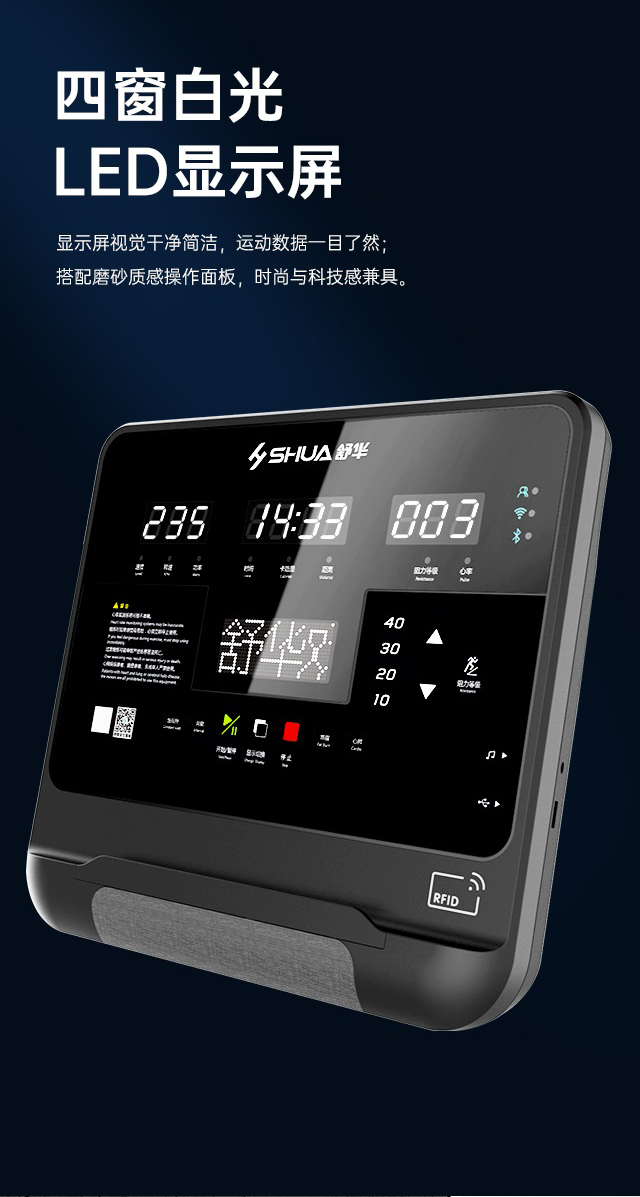 舒華高端跑步機(jī)SH-T9100T(V10+)擁有超大高清32寸10點(diǎn)觸控晶屏的工業(yè)屏,具有掃碼、刷卡、人臉識(shí)別等多種智能登錄方式,方便快捷,并且有在線(xiàn)教學(xué)、專(zhuān)業(yè)健身模式隨意切換,讓您開(kāi)啟科學(xué)健身。