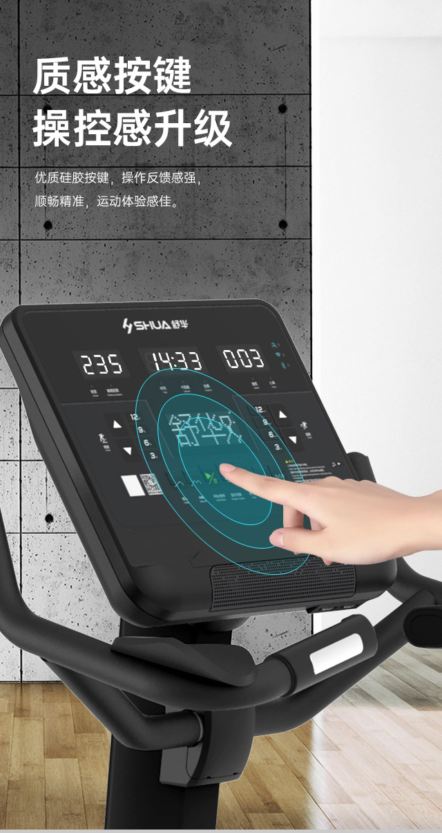 舒華立式商用健身車(chē)SH-B9100U(V10)觸屏版擁有超大顯示和操作屏幕, 可以任意設(shè)置阻力、時(shí)間和距離等參數(shù),還可以即時(shí)顯示心跳和轉(zhuǎn)速等數(shù)據(jù),同時(shí),SH-B9100U提供多項(xiàng)科學(xué)運(yùn)動(dòng)處方,更輕松掌握運(yùn)動(dòng)節(jié)奏。