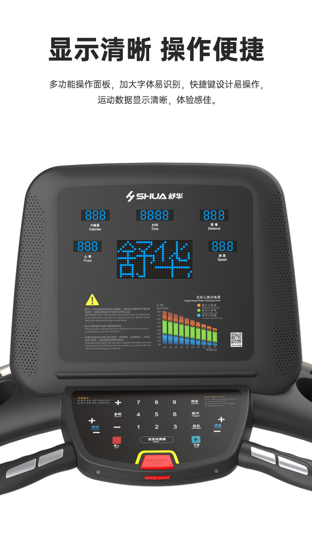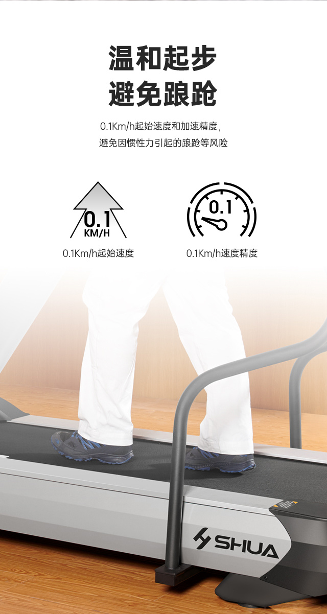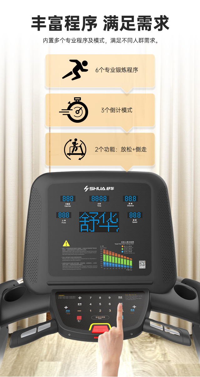 舒華V9尊享版跑步機SH-T899設(shè)有輔助上下機踏板的驅(qū)動踏板,控制速度在-5至10km/h內(nèi)可調(diào),坡度也可在-3至15%內(nèi)可調(diào),跑臺尺寸是580×1570mm,持續(xù)馬力是AC 3.0HP。